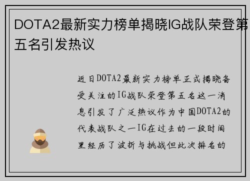 DOTA2最新实力榜单揭晓IG战队荣登第五名引发热议