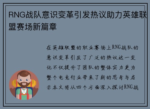 RNG战队意识变革引发热议助力英雄联盟赛场新篇章