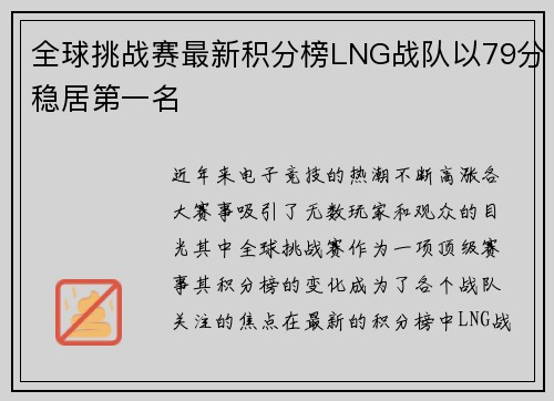 全球挑战赛最新积分榜LNG战队以79分稳居第一名
